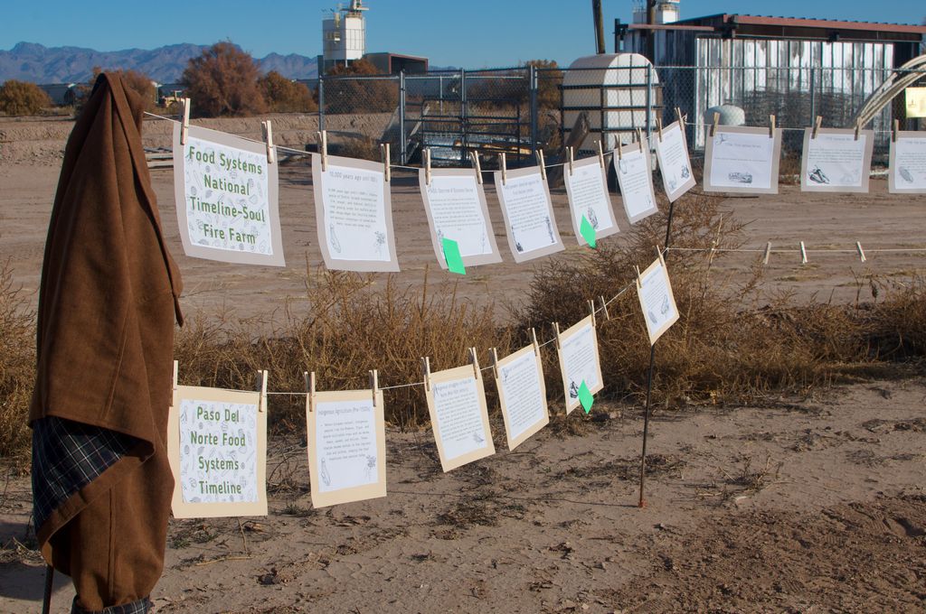 As I walk to meet Haylee for the first time, I see her in the field at La Semilla Community Farm, hanging pieces of paper from two clotheslines along with other staff members. I know she’s preparing an activity for the staff meeting, and I can’t wait to see it. I say hi from a far and I can sense in her gleeful response the kindness that I’ve now come to cherish whenever we see each other. As I come close, I finally make them out: two timelines showing the history of food systems, one for the United States, and another one for the El Paso del Norte Region.
